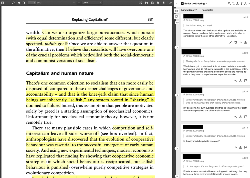 2. I have assigned each student to contribute a minimum of three annotations to each page. A question about something they have read, a general comment and a connection from one idea to another outside the reading. Something they have read from another source, something they have experienced or something they know from another media source.